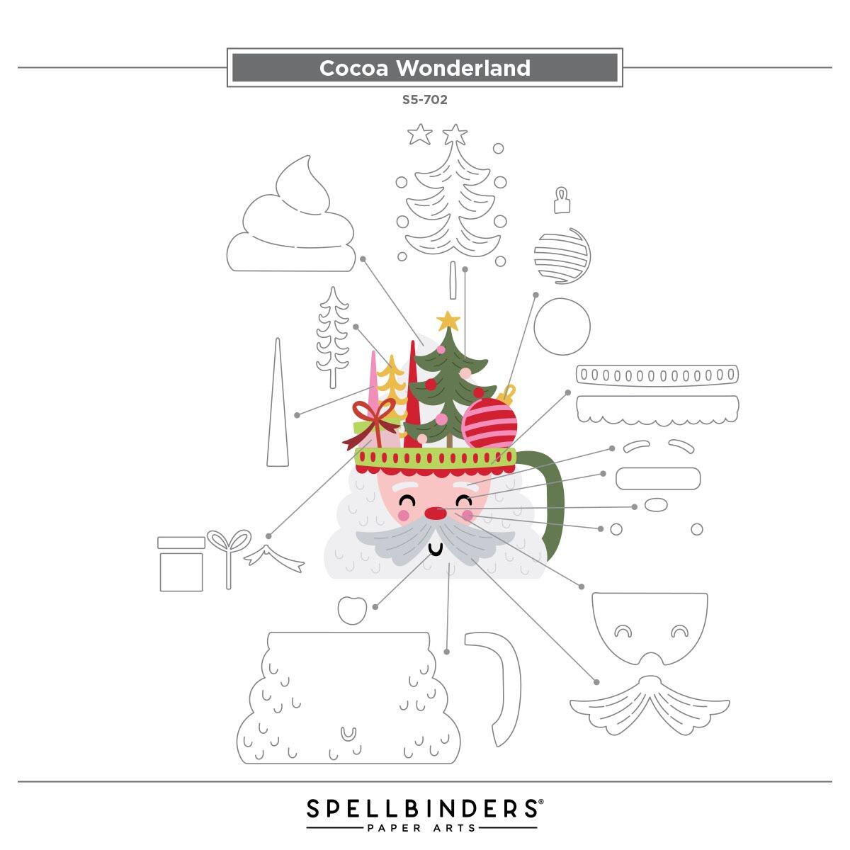 Cocoa Wonderland Etched Dies are from the Wonderland Collection. Create this adorable cocoa cup filled with many goodies using this set of 20 thin metal cutting dies. Add accessories such as holiday trees, ornaments, presents, and more into this wonderful Old St. Nick’s mug!